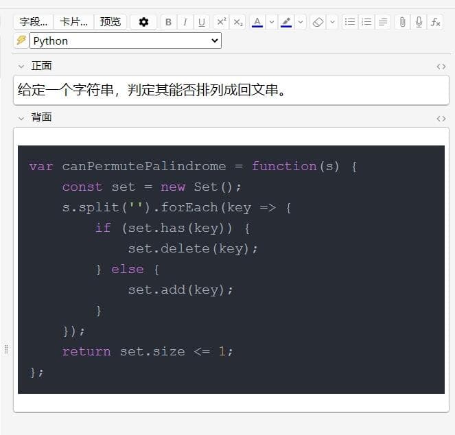 javascript1# 给定一个字符串,判定其能否排列成回文串.md 2 3var canPermutePalindrome = function(s) { 4 const set = new Set(); 5 s.split('').forEach(key => { 6 if (set.has(key)) { 7 set.delete(key); 8 } else { 9 set.add(key); 10 } 11 }); 12 return set.size <= 1; 13};